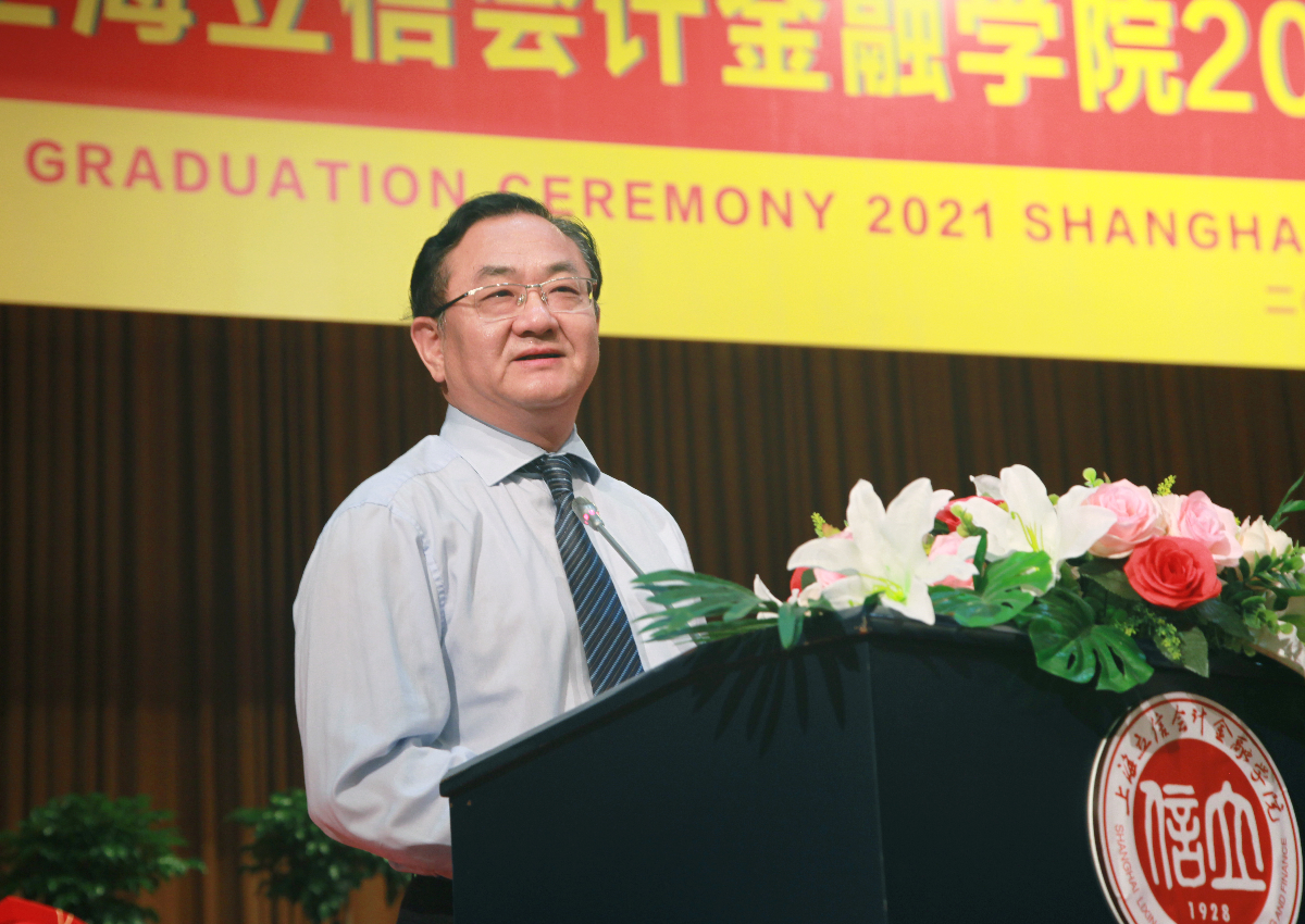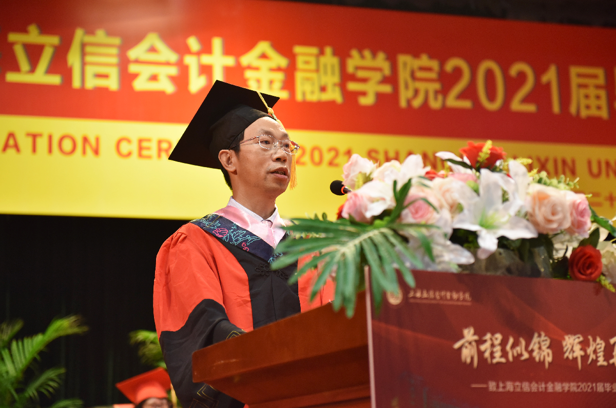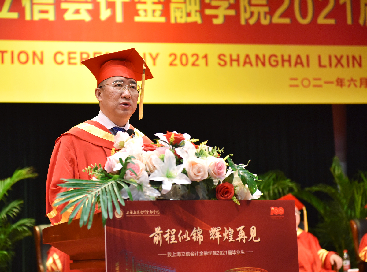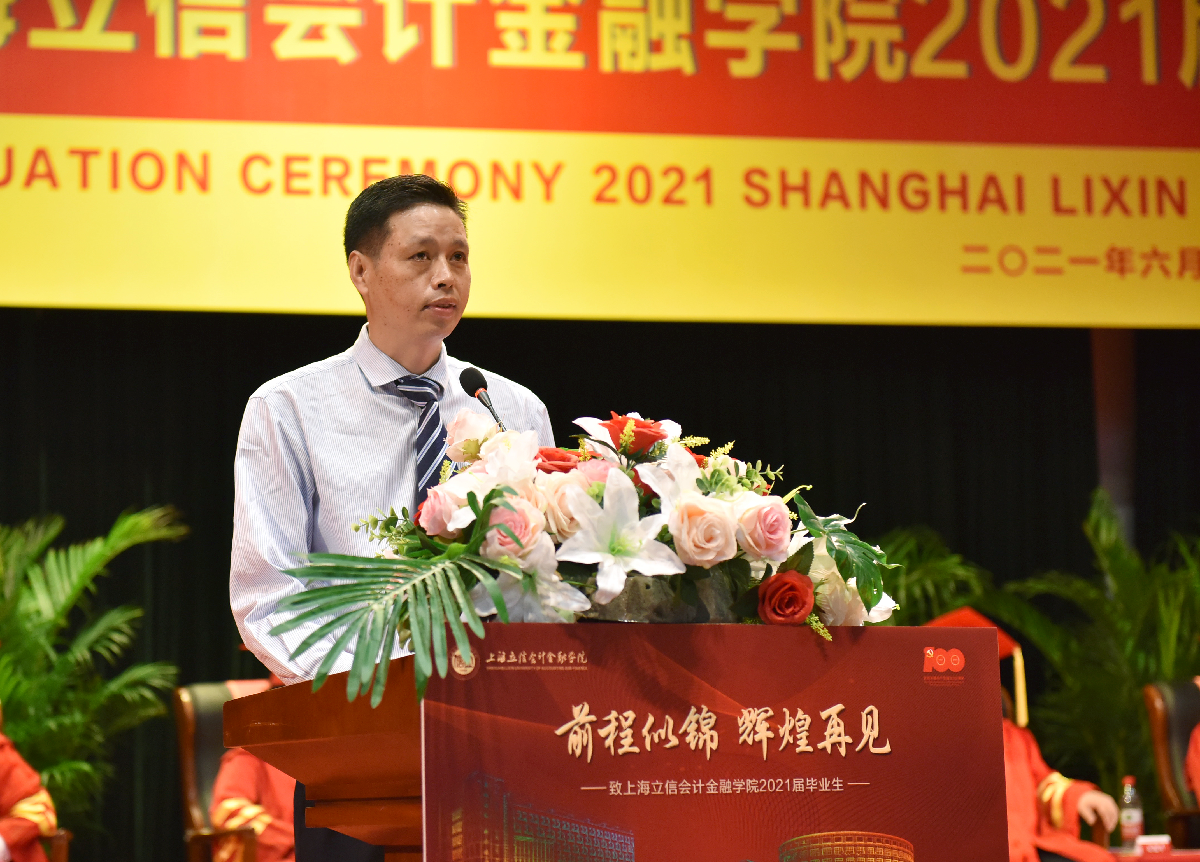离别之际,杨力代表学校向广大毕业生致以热烈的祝贺,对辛勤付出的老师和家长表达了衷心的感谢和由衷的敬意。杨力与毕业生们分享了三则立信校友的故事,以重温“财经战线红管家”李建模校友铁肩担道义、热血保家国的爱国情怀,鼓励同学们赓续立信文脉,传承红色基因,在实现中国梦的伟大实践中创造自己的精彩人生;以重温“熔铸在大西北建设中的螺丝钉”蒋娟芬校友默默坚守、不计得失的奉献精神,叮嘱同学们在面对国家和民族利益、面对社会责任和价值选择时,要始终坚守良知,不忘初心;以重温“中国现代会计之父”、我校创校校长潘序伦先生敢为天下先的创新精神,寄语同学们能够胸怀大局,敢为人先,热切拥抱已经到来的新时代,使自己过得更好,让国家变得更强。最后,杨力深情嘱托立信新校友们,要将爱国情怀、奉献精神、创新意识以及诚信品格,一并打包放入行囊,守护好母校给予大家的宝贵财富。牢记新时代赋予立信学子的新使命,在党的领导下前赴后继,继续谱写伟大的“青春之歌”!
