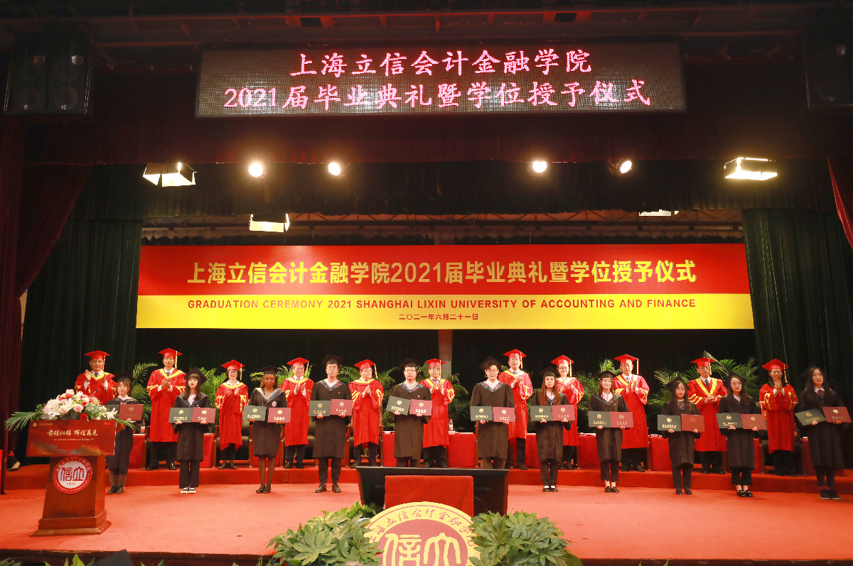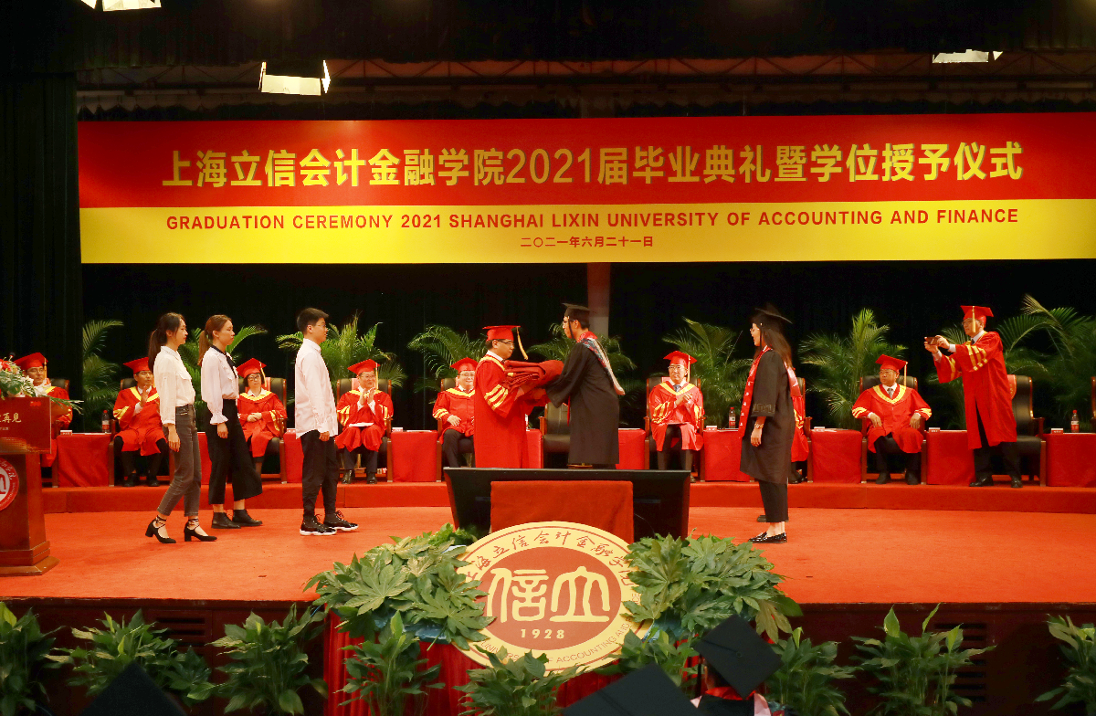 典礼上,校党委副书记文选才宣读2021届校友年级理事聘任决定;校党委副书记、纪委书记、监察专员刘艳宣读2021届市级、校级优秀毕业生表彰决定;副校长陈洁宣读2021届本、专科学生准予毕业和学位授予决定。校领导为毕业生代表颁发毕业证书,行拨穗正冠礼并颁发学位证书,为校友年级理事颁发聘书,为市级、校级优秀毕业生代表颁奖并送上学校精心准备的“纪念算盘”。