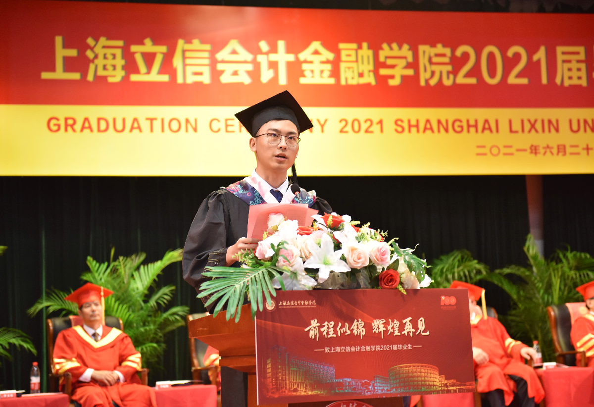 财税与公共管理学院优秀毕业生代表谷悦嘉、金融科技学院优秀毕业生代表郜真带领全体毕业生回顾四年成长点滴、感恩母校师生情谊,号召同学们立鸿鹄志、做奋斗者,以青春之我,创建青春之中国,同铸立信之荣光。