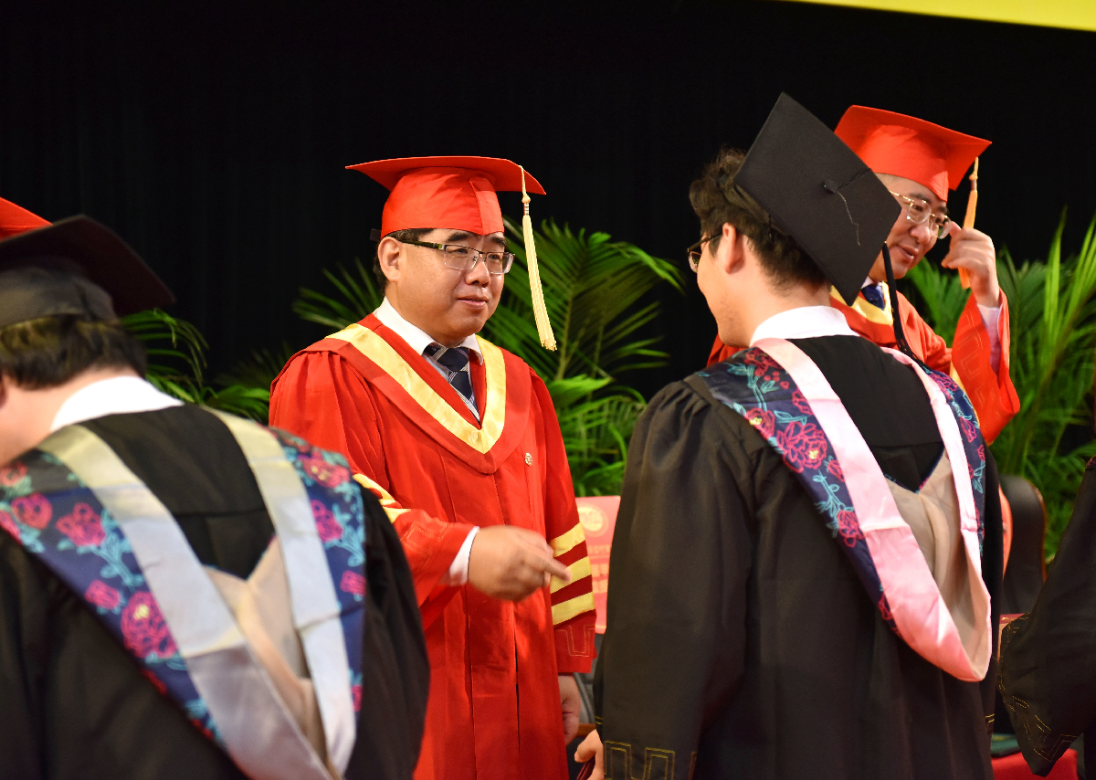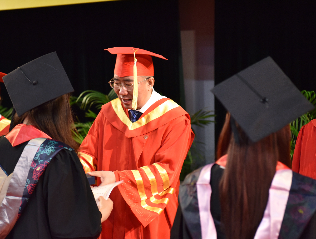 毕业典礼上举行了庄重的校旗传递仪式。解超接过毕业生代表呈送的校旗,并将校旗授予在校生代表,寓意一代代学子践行“立信”校训,弦歌不辍,薪火相传,这面校旗所凝聚和承载的光荣与梦想、责任与使命,将在一届又一届立信学子身上传承。