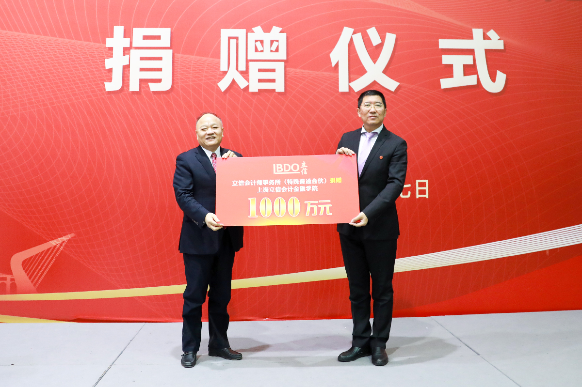 校党委副书记、校长杨力代表学校接受捐赠并致辞。杨力表示,朱建弟董事长和立信会计师事务所长期热心公益、捐资助教,为学校发展注入了源源不断的生机与活力。朱建弟校友在获得巨大商业成功的同时不忘师恩、回馈母校,用实际行动传承践行着潘老的奉献精神,堪为我辈楷模。未来,学校将更加精准定位自身在国家人才链、创新链、产业链中的位置,主动适应、对接上海和长三角现代服务业的高质量发展需求,在创建高水平应用型财经类大学的道路上,抢抓机遇、找准目标、发挥优势、积极作为、提质赋能,为上海和国家经济社会发展提供更加强大的智力支撑和人才支持,将潘序伦先生创立的立信会计事业进一步发扬光大。