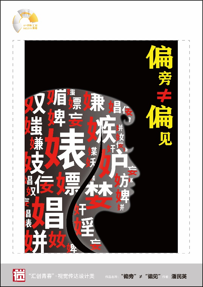 近日,第七届“汇创青春”——上海大学生文化创意作品展示活动获奖结果出炉,人文艺术学院教师陶绮骋指导的学生潘民英招贴作品《“偏旁”≠“偏见”》脱颖而出,获得视觉传达设计类三等奖。
