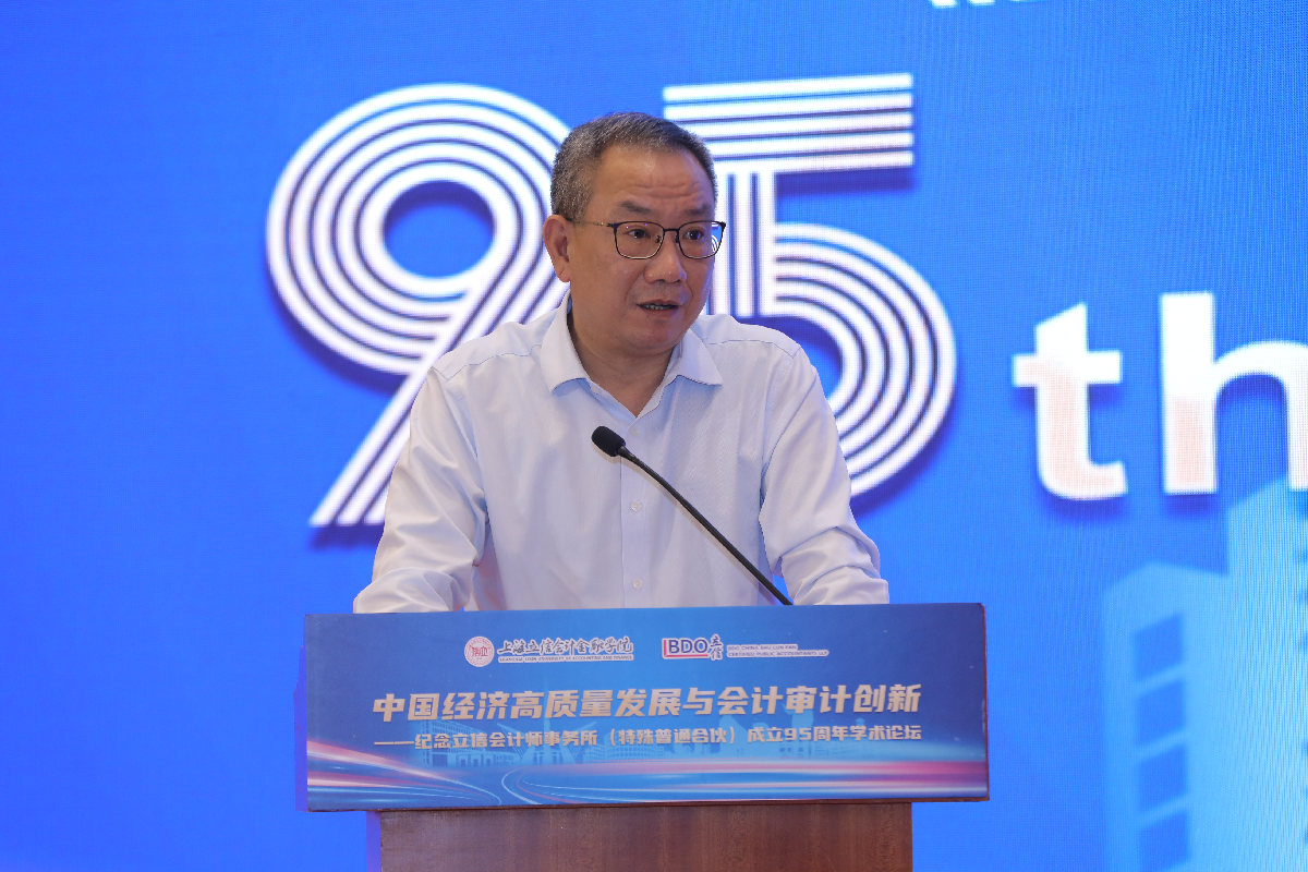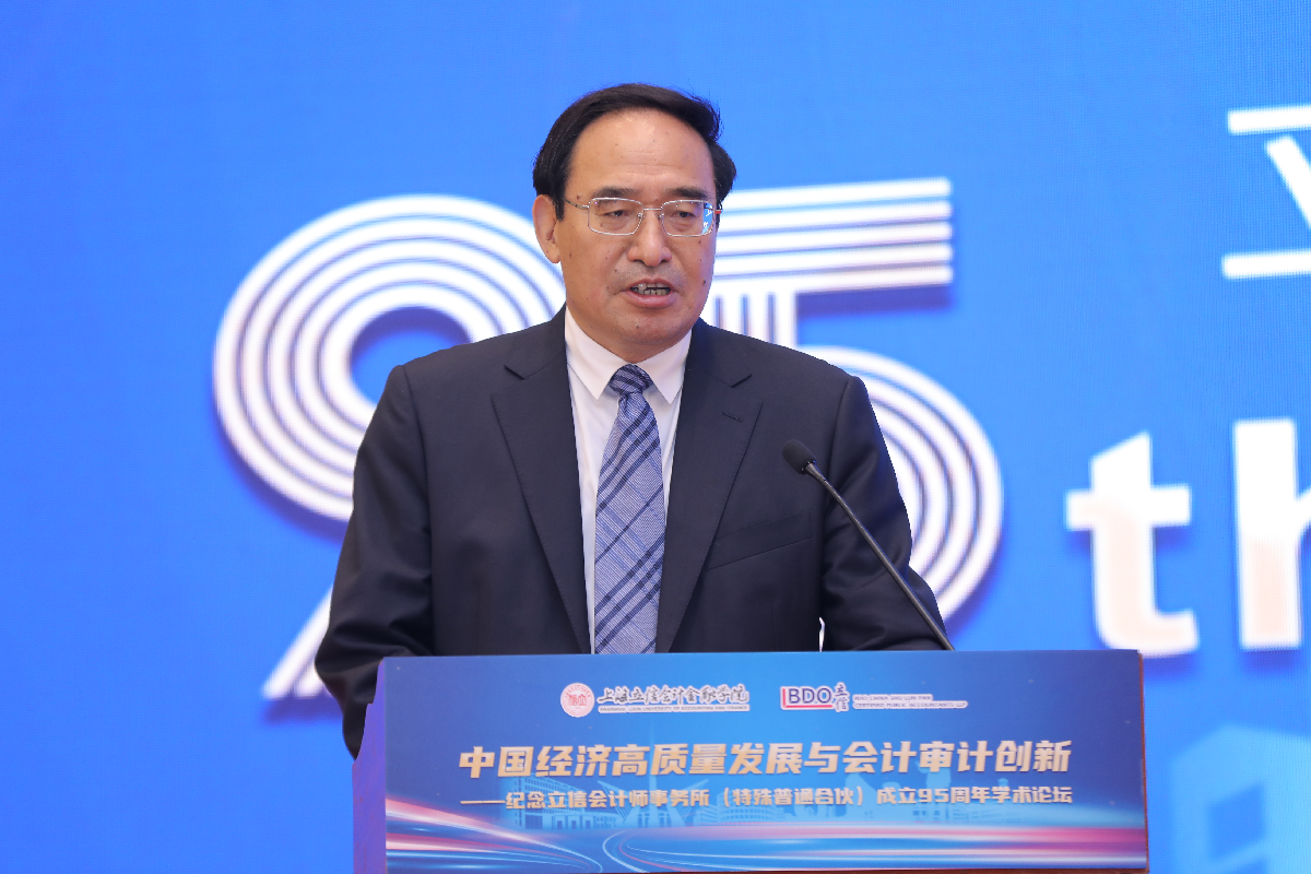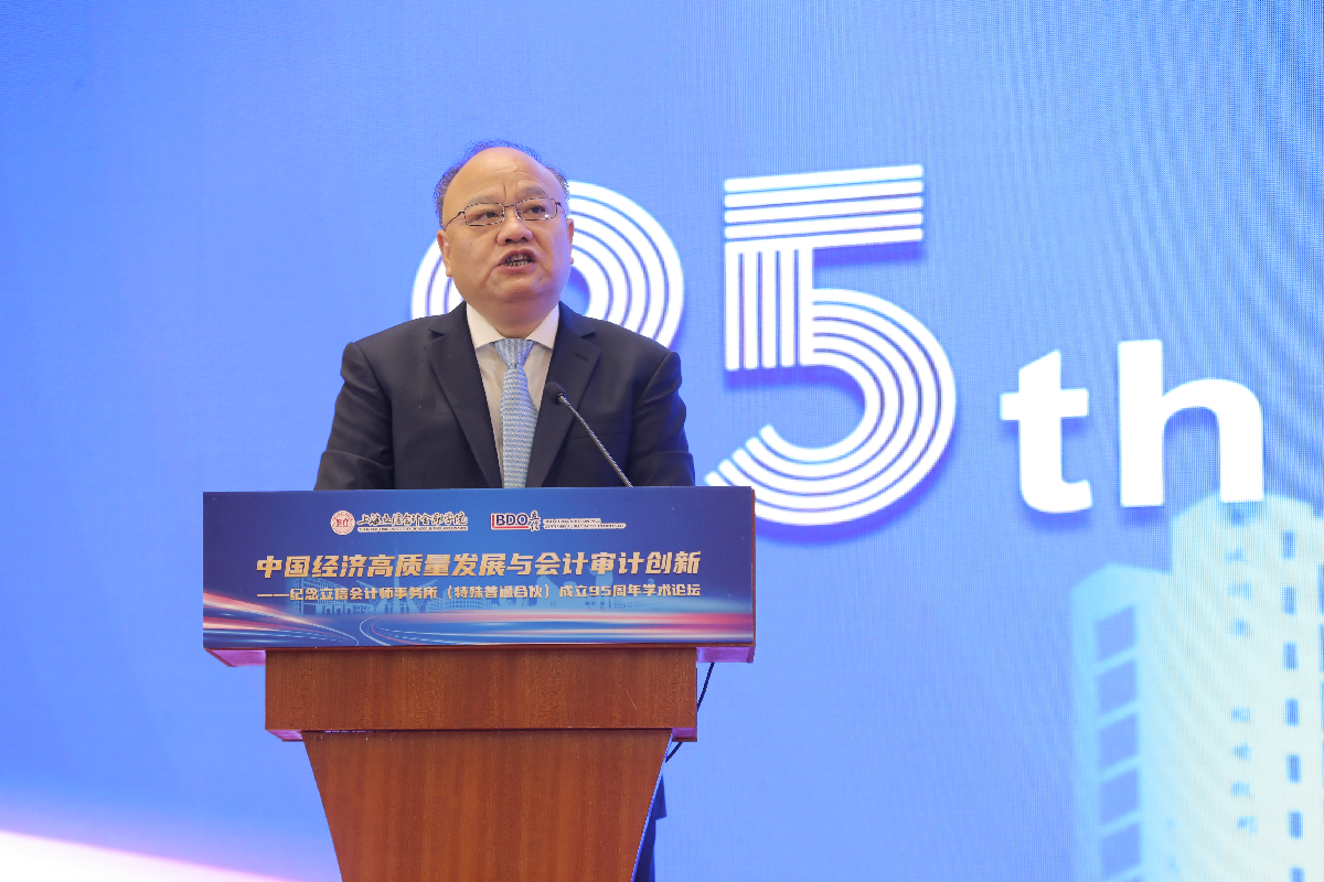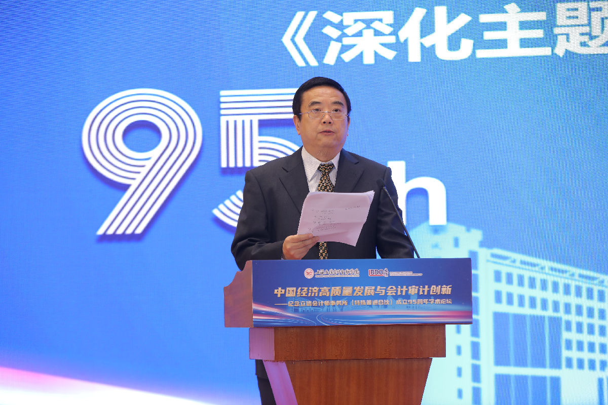 周汉民在致辞中表示,今年是潘序伦先生创立的立信会计师事务所成立95周年,潘序伦先生先后创办立信会计师事务所、立信会计专科学校和立信会计图书用品社,开辟了“三位一体”的会计事业发展先河。此刻以举办高端研讨会的形式进行纪念,学习传承弘扬先贤精神,意义重大。当下世界正处于百年未有之大变局,中国经济持续快速发展,面对机遇与挑战,希望论坛汇聚更多智慧和力量,为会计审计创新推动中国经济高质量发展提供更多思路和建议。他号召与会者向潘序伦先生等前辈先贤学习,努力沿着改革开放的道路坚定前行。