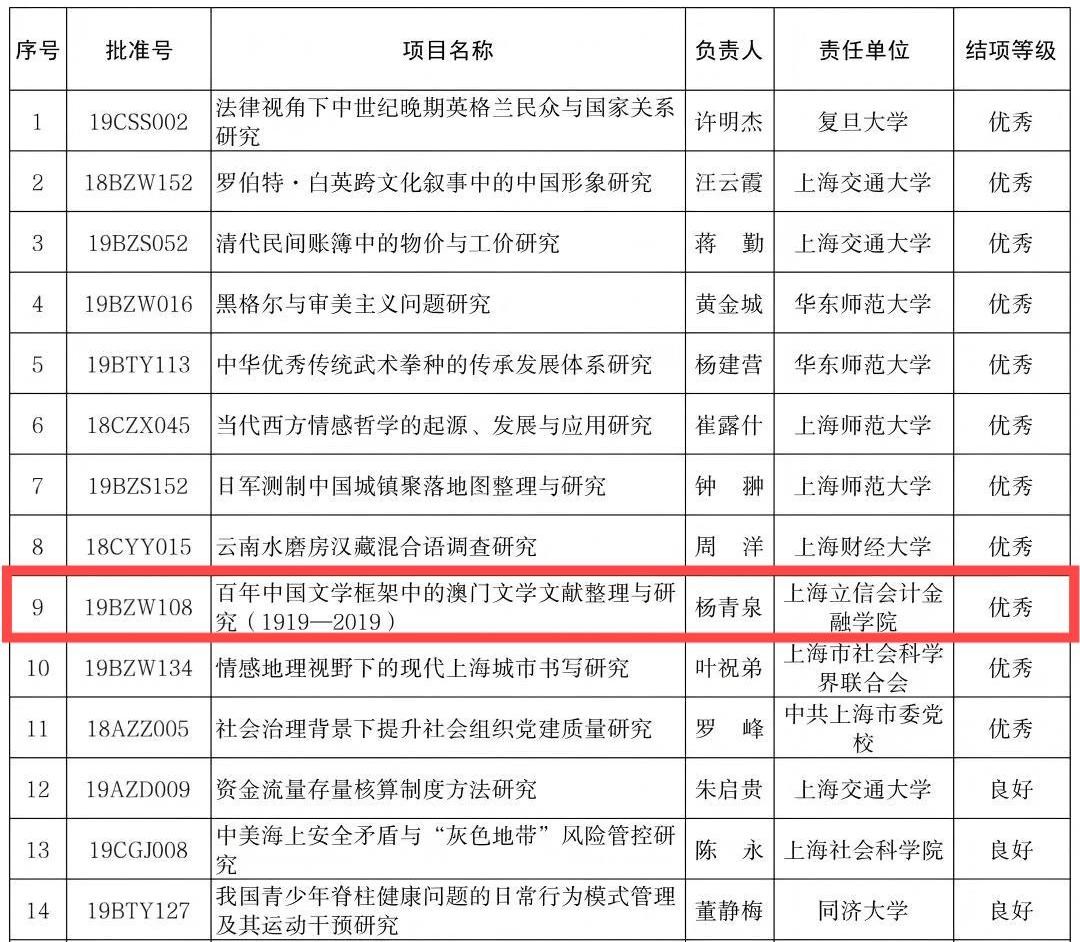 近日,我校人文艺术学院教师杨青泉主持的国家社科基金年度项目“百年中国文学框架中的澳门文学文献整理与研究(1919—2019)”(项目批准号:19BZW108)经同行专家鉴定,结项成果获评“优秀”等级。