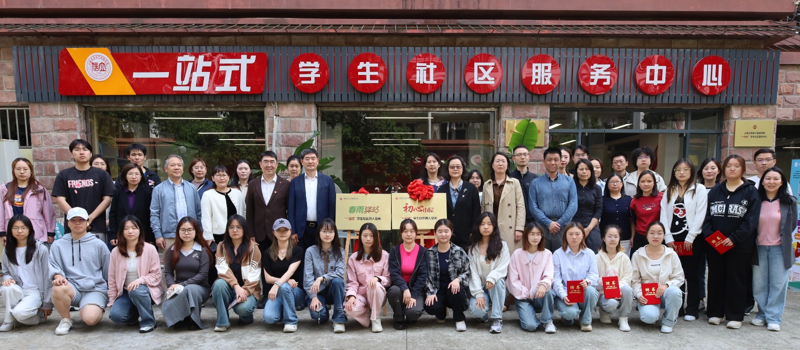 刘艳、陆友清共同为“初心小屋”“春雨驿站”揭牌。学院院长张毅强为“一站式”学生社区管理服务团队颁发聘书。