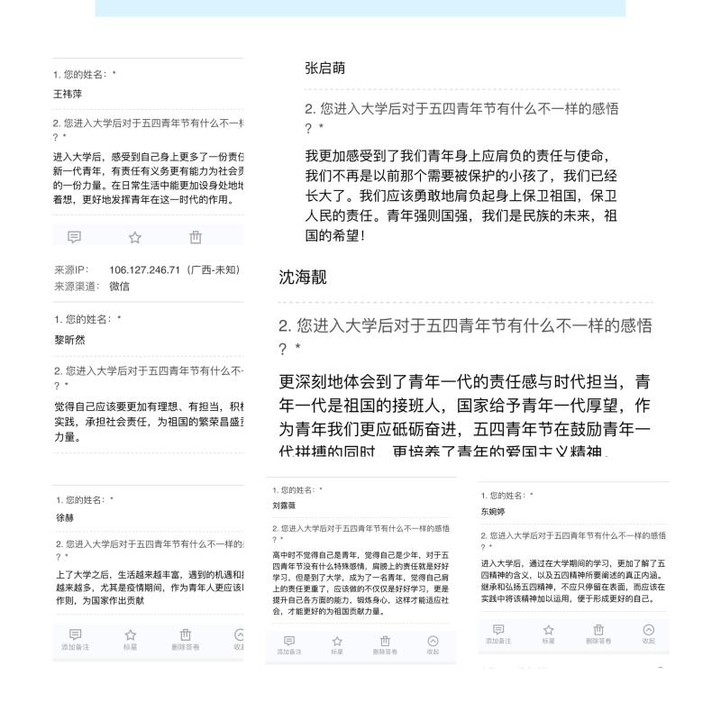 我校青年学子们在学习贯彻习近平总书记重要回信精神中激情澎湃,热潮迭起,纷纷表示将牢记嘱托,坚定理想信念,厚植爱国情怀,传承五四精神,勇于担当重任,磨砺意志品质,锻炼过硬本领,以实际行动为实现中华民族伟大复兴中国梦的新长征路上奋勇搏击。今年5月4日是五四运动101周年纪念日。在五四精神火种第二个百年接续传递进程中,我校广大青年充分展现出在应对困难和挑战中积极向上、坚忍不拔、争做时代先锋的担当精神。