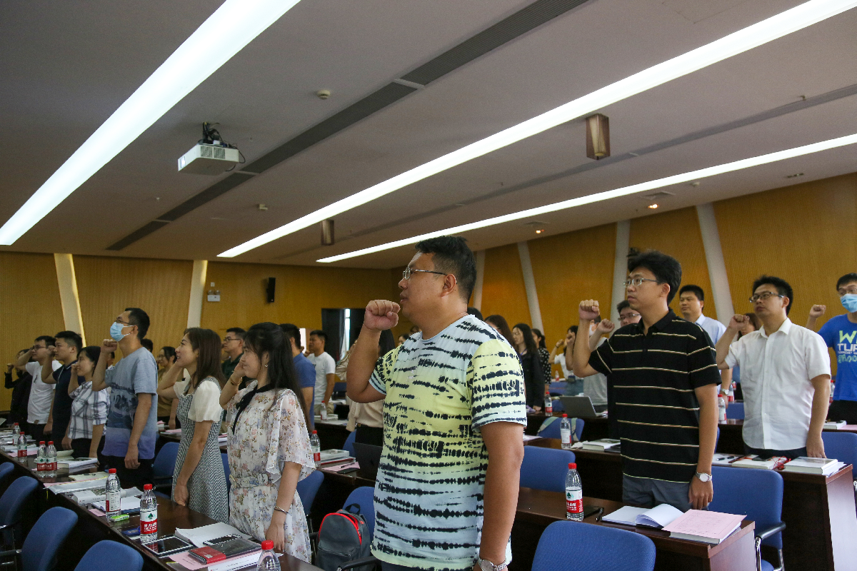 金融学院副院长(主持行政工作)张云带领全体新教工共同宣誓。常任轨教师代表、统计与数学学院金立斌老师,骨干教师代表、法学院叶莉娜老师,青年教师代表、国际经贸学院辛广益老师分别分享了在立信的成长经历和工作心得。