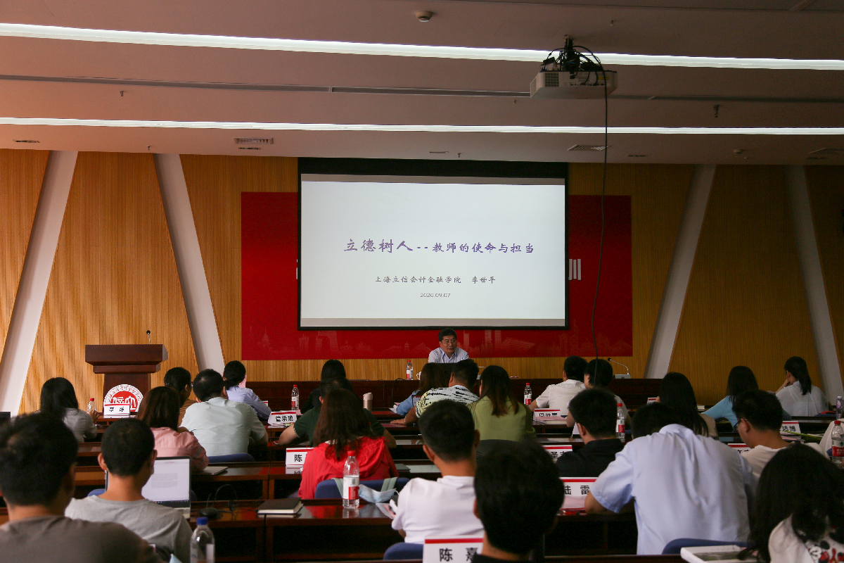 上海师范大学心理学教授贺雯做了《高校师生沟通——从透视学生开始》,以生动的案例揭示了如何真正做到透视学生心理、实现师生有效沟通。会计学院特聘教授万华林做《也谈教师职业成长》专题报告,从职业规划、执行计划、持续优化、合作共赢等四个方面分享了自己多年来教学科研方面的心得与技巧。统计与数学学院辅导员聂含聿做了《教师积极育人心态的养成》专题报告,从辅导员视角诠释教师与大学生沟通应注意的问题,并分享自我舒压的技巧。带教导师代表国际经贸学院教授赵晓霞、统计与数学学院副教授李晓彬分别分享了自己多年的指导新教师的技巧、方法和经验。教务处、科研处、人事处、教师教学发展中心、图书馆和信息办等部门分别就各自部门的规章制度做了介绍。
