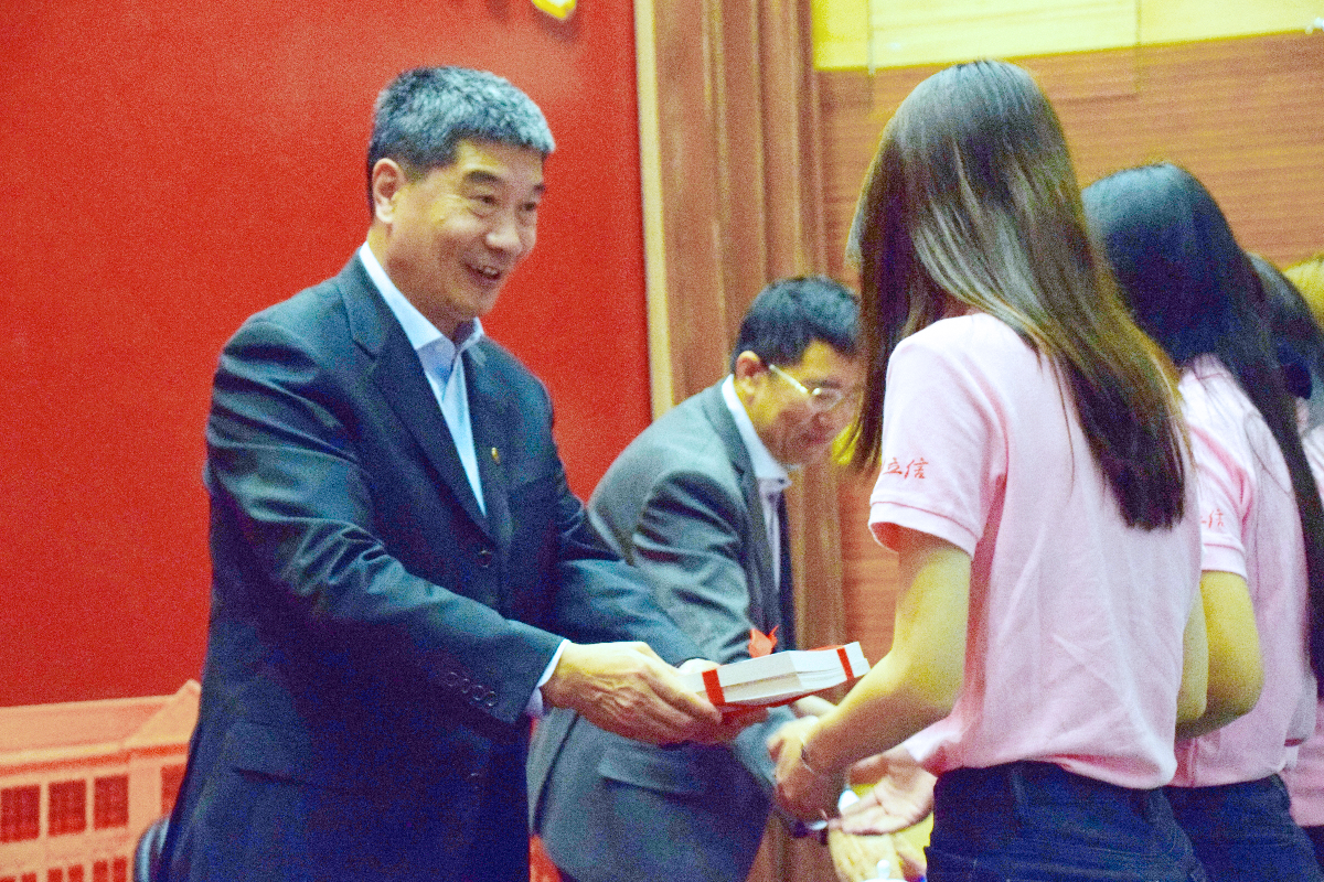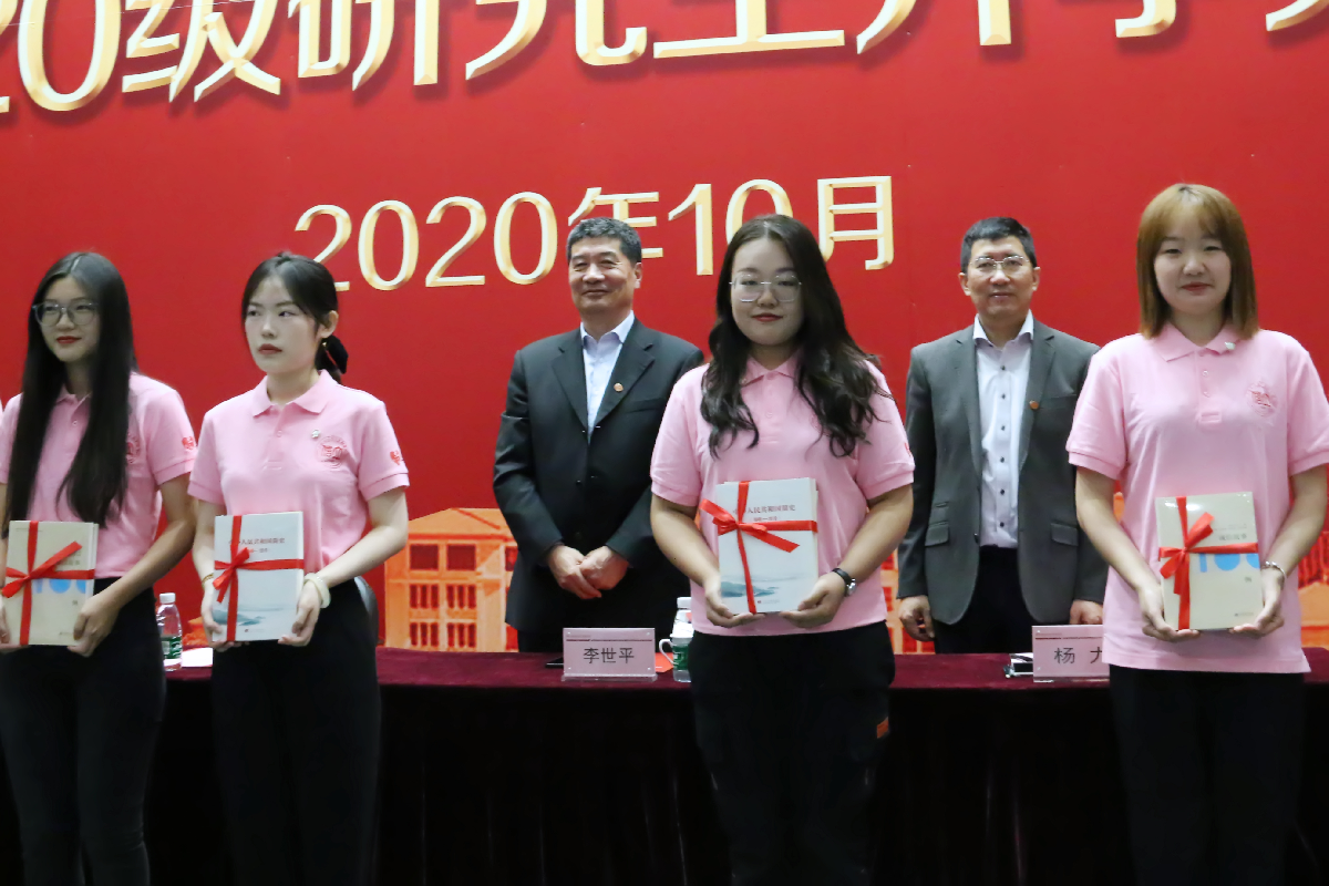 在校徽佩戴仪式环节,李世平、杨力共同为研究生新生代表佩戴校徽,勉励他们:从此作为“立信人”,承载着“立信”的诚信品质,更承载着立信人的使命与荣光。在书籍赠送环节,校领导代表学校向研究生新生代表赠送三套丛书:《四史》教育系列书籍、《诚信故事100例》《研究生学术道德案例教育百例》,寄语他们:以史为镜,知史爱国,传递初心薪火,勇担肩上使命;传递诚信文化精髓,将立信的品格融入学习生活中,以诚实守信作为做人的内在准则,在学术研究中秉持科学精神,恪守学术道德。