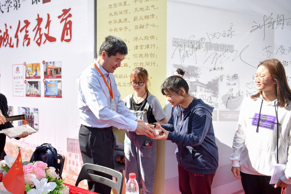党委书记李世平等校领导为新生赠送《诚信故事100例》和诚信书签,希望新生传承立信文脉,并为报到当日生日的新生赠送了学习用品作为特殊的生日礼物,希望同学们学业有成、前程似锦。