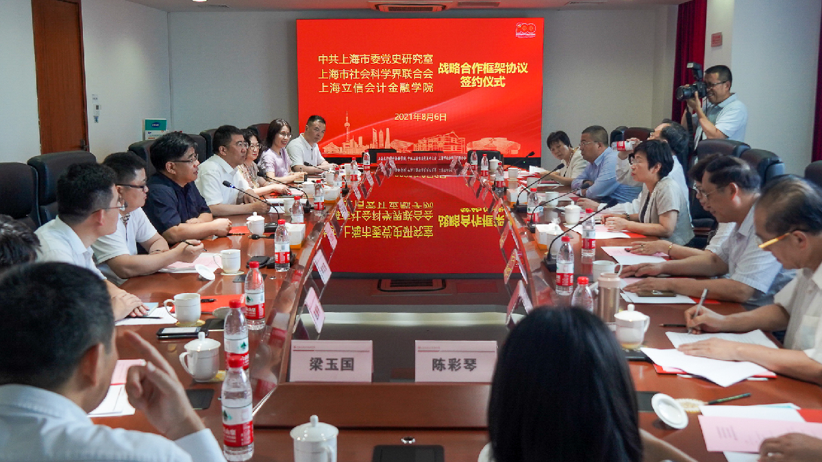 8月6日,上海立信会计金融学院与中共上海市委党史研究室、上海市社会科学界联合会战略合作框架协议签约仪式在浦东校区举行。中共上海市委党史研究室主任严爱云,上海市社会科学界联合会党组书记、专职副主席权衡,校党委书记解超,上海市政协文史资料委员会原主任、上海市党建研究会原常务副会长冯小敏,中共上海市委党史研究室副主任谢黎萍,上海市社会科学界联合会专职副主席任小文,上海市中共党史学会会长忻平,校党委副书记文选才、副校长陈洁出席签约仪式。签约仪式由校党委副书记、校长杨力主持。