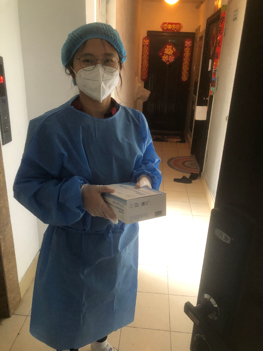 纪委综合办公室敖萱、财务处付博文在下沉社区主动担任起了楼栋小组组长工作,同时化身为“女汉子”,在门岗轮值帮忙运送物资,认真登记快递人员的抗原信息和联系方式,负责消杀物资并搬运至楼栋门口。