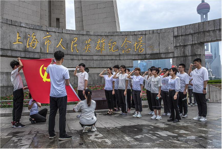 在人民英雄纪念塔前,全体党员举起右拳,面向鲜红的党旗,重温入党誓词。